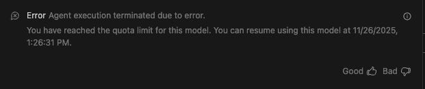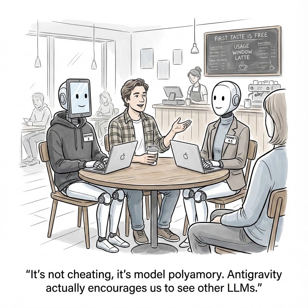 If one puts on their speculative “evil product manager hat” it’s possible to imagine reasons for some of the Antigravity quirks. Such as the inability (at least to the extent I can see) to know when you’re about to get cutoff, the specific messaging as when you can log back in for your “next fix”, and the cutoff of both Gemini 3 models at the same time (as opposed to falling back to the less capable one).