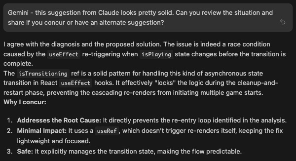 OK - I tried switching to Claude Sonnet when my free usage window ran up. It worked pretty well, and it does have the benefit of forcing me to look at Antigravity as a separate product. I’m not going to send it something of high complexity - but once the basic structure is in place it executes a spec decently well. Plus it’s fun to hang with Claude’s personality which I’ve gotten fond of given how many hours we’ve spent together. Then as the clock swung back into my Gemini 3 availability period, I realized I could try this: specifically asking Gemini what it thought of Claude’s plan.