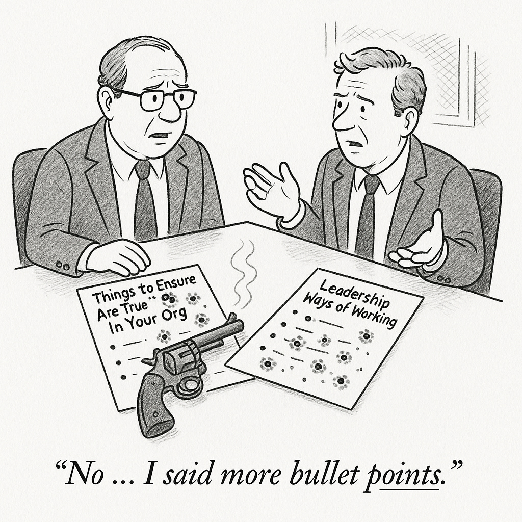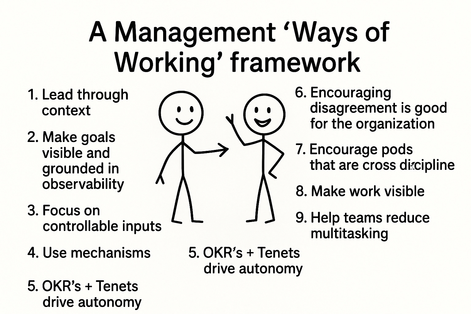 OKR’s + Tenets drive autonomy: Once alignment is achieved - encourage autonomy with connections through OKR’s. Document goals and when possible pre-load how we think about decision making with tenets. I’ll write more on tenets in the future.
